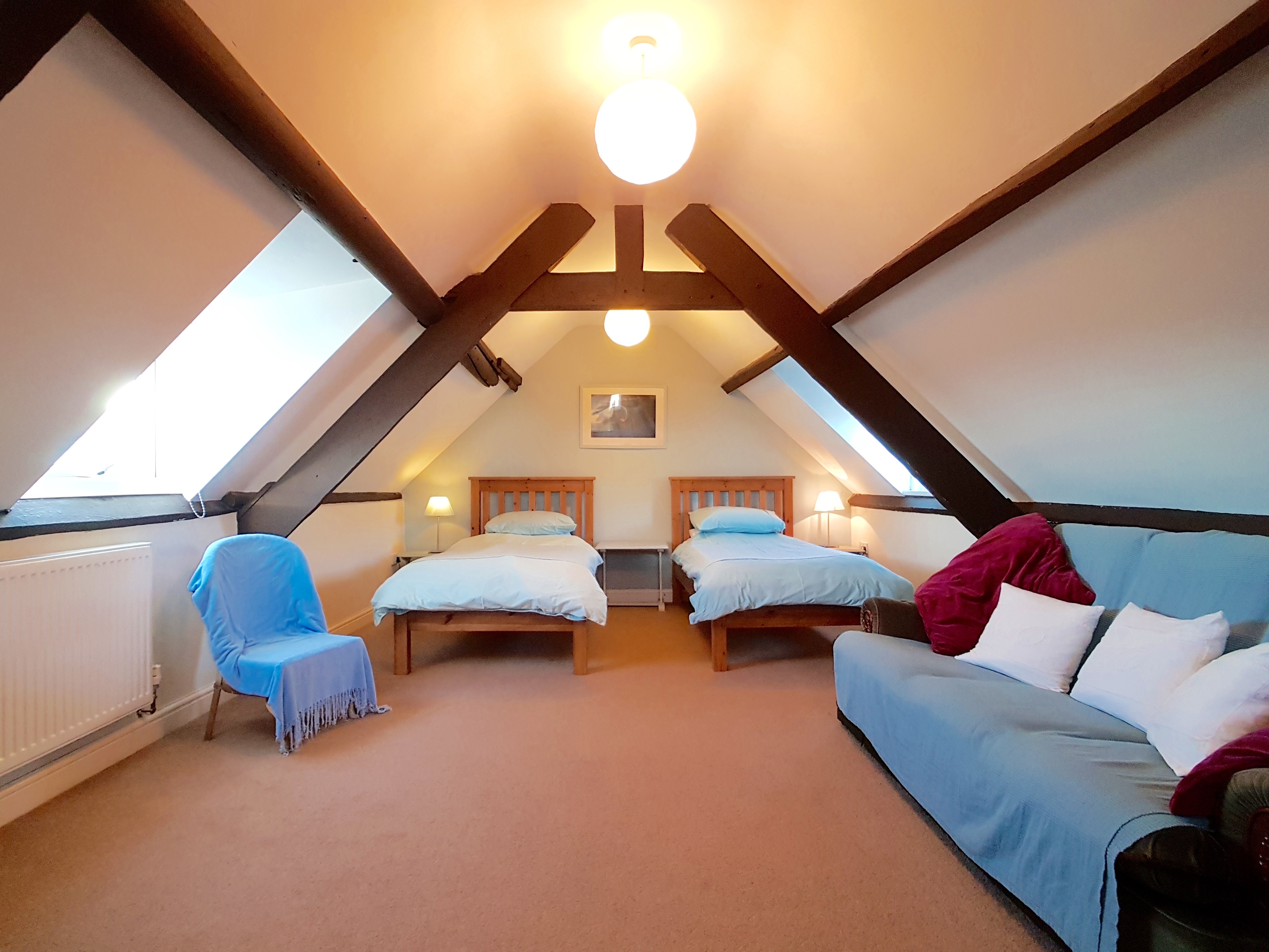 The top floor has a large attic room with two double beds and its own TV and DVD. Guests tend to find this is a good bolthole for the children.